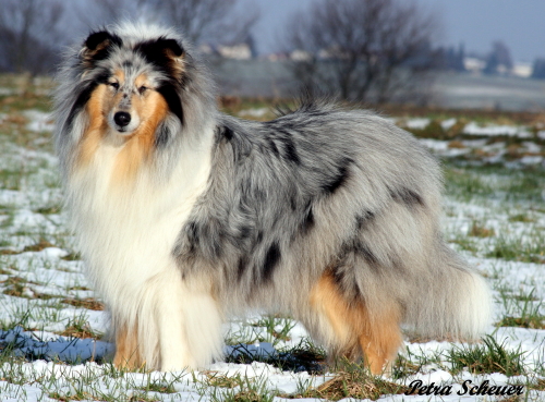 Butterfly, unsere herausheragende Butterfly. Das hätten wir uns nicht zu träumen gewagt.Sie ist das Wagnis eines sogenannten Outcross, mit dessen Resultat wir mehr als glücklich sind. Geradezu alle Blue-Merle aus diesem Wurf hatten braune Augen und bis auf eine Maus, erbten sie die optischen Merkmale ihrer Mama Julia. Butterfly ist eine sehr kräftige Hündin mit einem sehr schönem ausgefüllten Vorgesicht. Ihre Farbe ist traumhaft, ein schönes klares Blau. Sie hat einen sehr vorwitzigen und liebevollen Charakter. Wir sind sehr stolz auf diese kleine blaue Hexe. Sie ist die Stammhündin unserer blue-merle Linie. In ihren Kinder Only heaven could bestow und Once in a Lifetime hat sie bewiesen, wie stark sie in ihrer Vererbung ist. Das Wagnis hat sich somit mehr als gelohnt, einmal mehr eine eigene blaue Linie zu schaffen.